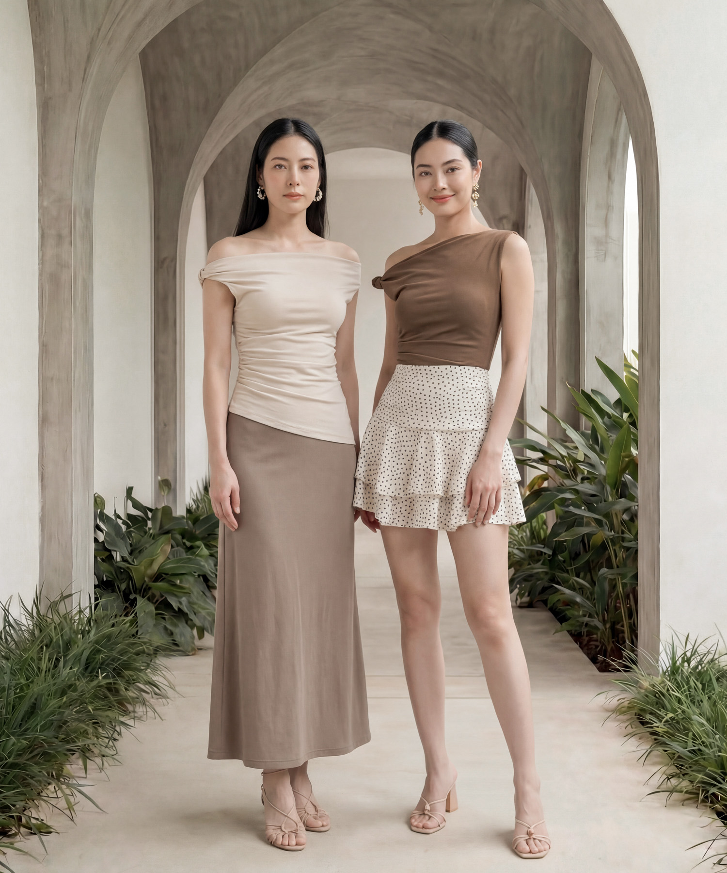 Sleeveless off-shoulder top with asymmetrical hemline