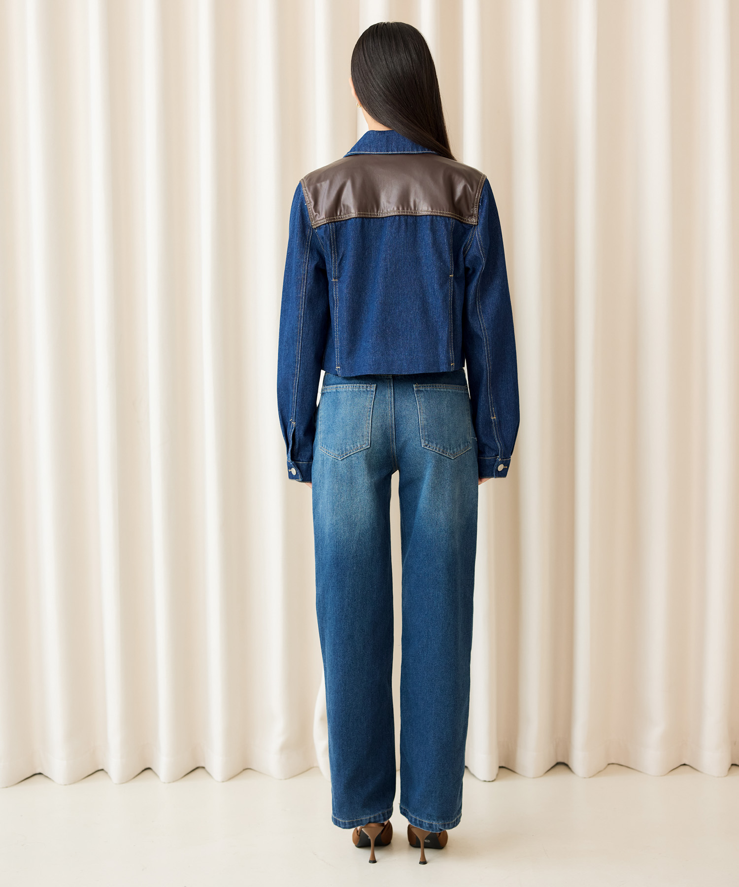 Denim jacket with faux leather detail at shoulders