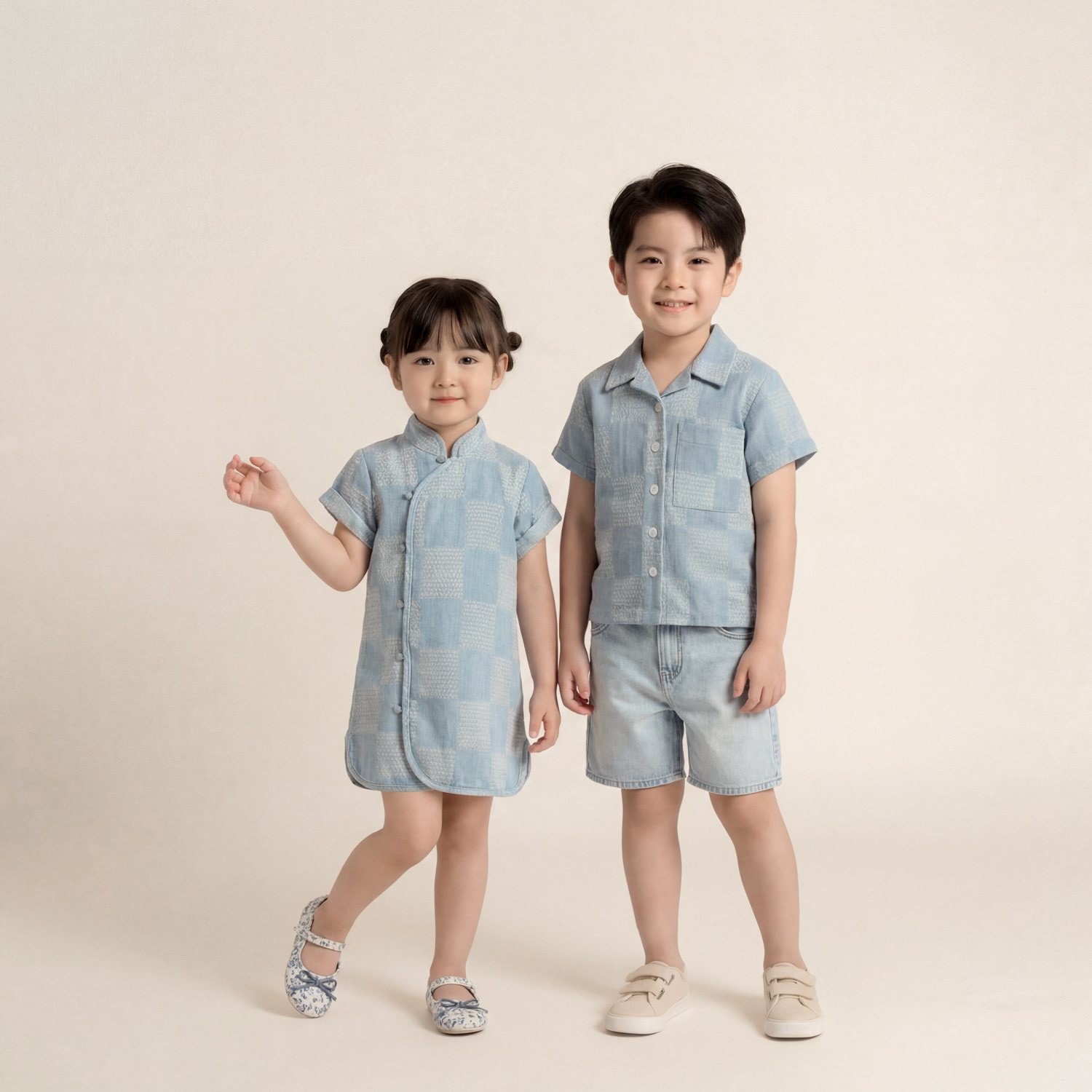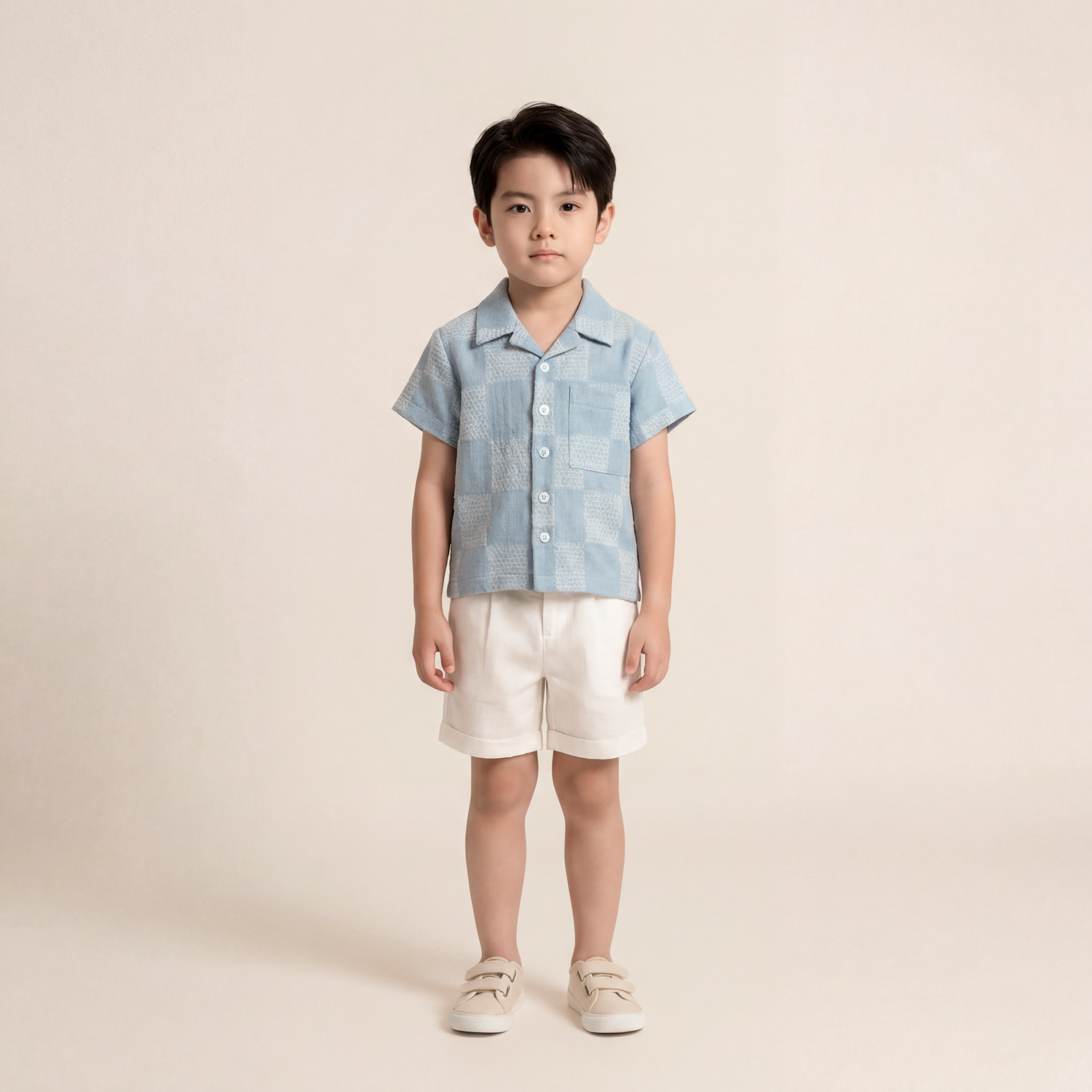 Checkered denim short sleeved shirt